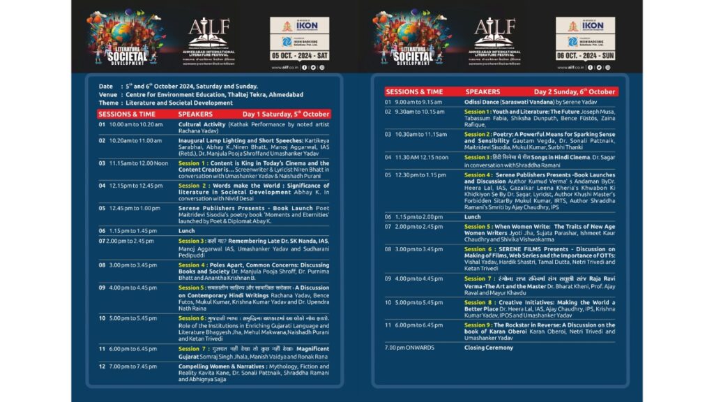 Niren Bhatt will discuss about the content writers in the films in conversation with Naishadh Purani and Umashanker Yadav while Abhay K. will talk about his books and their significance in creating a better world.